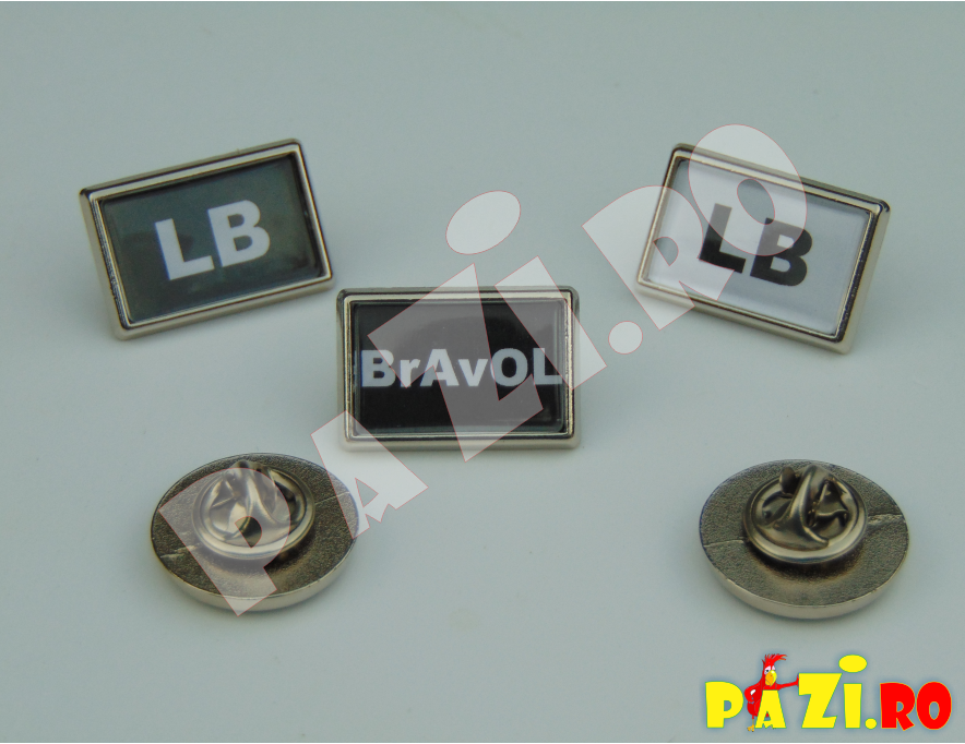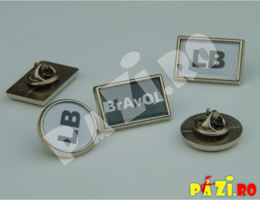 Pot fi rotunde, cu diametrul de 20 mm, patrate cu latura de 17 mm sau dreptunghiulare cu dimensiunea 24x16 mm. Aceste insigne au baza aurie sau argintie si au ca sistem de prindere ac si fluturas.